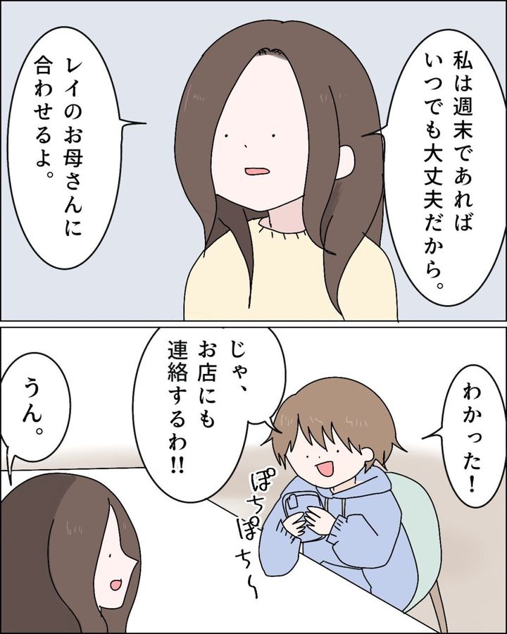 「私は週末であればいつでも大丈夫だから、レイのお母さんに合わせるよ」そう伝えると、レイは待っていましたと言わんばかりに、すぐに段取りを立て始めます。将来のことを考えてくれてはいるようでしたが、なんだかレイに不安しか感じませんでした。