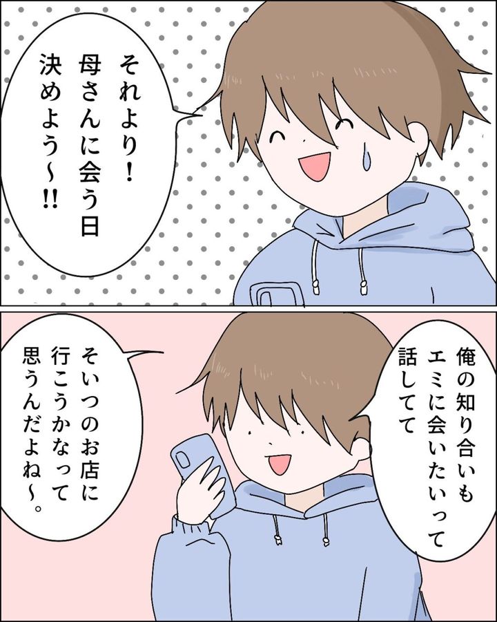 都合が悪くなったのか「それより!母さんに会う日決めよう!」と不自然に話題をすり替えると、「俺の知り合いもエミに会いたいって話してて、そいつのお店行こうかなって思うんだよね~」と一方的に話を進めていきます。