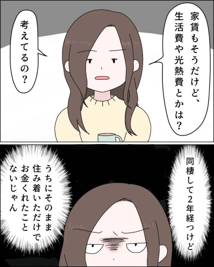 レイの勝手すぎる提案に、私は思わず「家賃もそうだけど、生活費や光熱費とかは?考えてるの?」と聞き返します。同棲して2年経ちますが、レイは私が社会人になったと同時に借りたこの部屋にそのまま住み着いただけで、家賃はもちろん光熱費すら一度も払ってくれたことはありません。