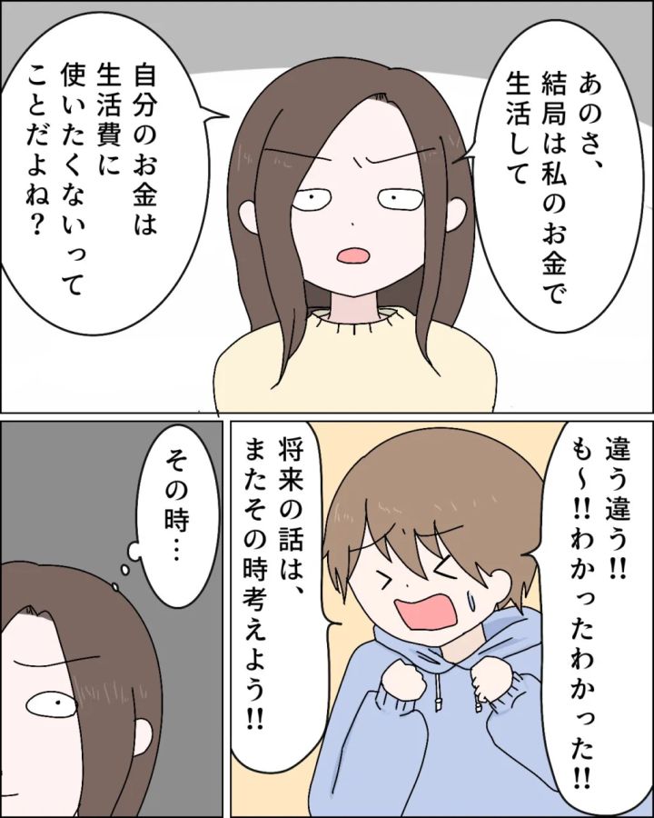 「あのさ、結局は私のお金で生活して、自分のお金は生活費に使いたくないってことだよね?」私がズバリそう言うと、レイは急に面倒くさそうな顔をして「違う違う!も~将来の話はまたその時考えよう!」と、強引に話を終わらせました。