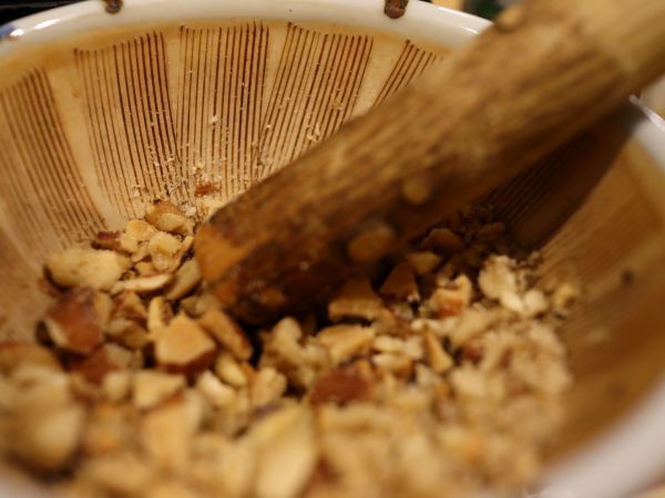 すり鉢で木の実を自分で粗さを調整しながら潰し、そこに蕎麦汁を注ぐ。