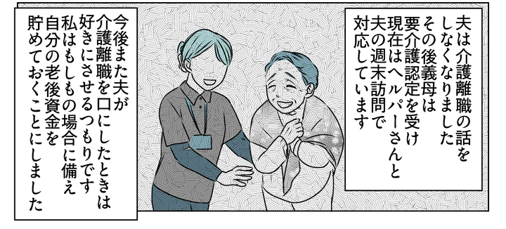 マチコさんと話した夫は離職を口にしなくなり、まずは介護認定とヘルパー利用で対応すると決めたようです。私は夫が再び離職を言い出した場合に備えて、自分の老後資金をいっそう意識するようになりました。