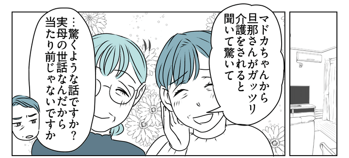 私(マドカ、40代後半)は夫(アキオ、50代前半)との二人暮らし。一人息子は昨年社会人となり、家を出ました。最近、近所に住む義母(スミレ、70代)が体調を崩しやすくなり、夫を呼び出すことが増えました。私が「介護は実子で」と言ってきた甲斐もあり、義母の世話は夫が一人で対応しています。しかし突然、夫が介護離職するかも、と言い出したのです。私は先輩(モリ、50代半ば)の助言で義母の考えを聞いてみると、義母は外部サポートに抵抗がなく、むしろ夫が「親孝行」にこだわっているようでした。そこで私は介護歴30年のマチコさん(60代)から夫に介護の現実を話してもらうことにしたのです。