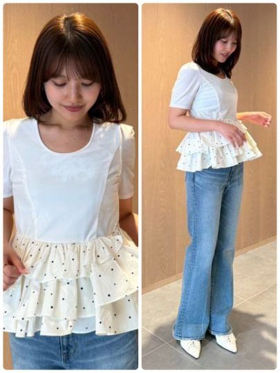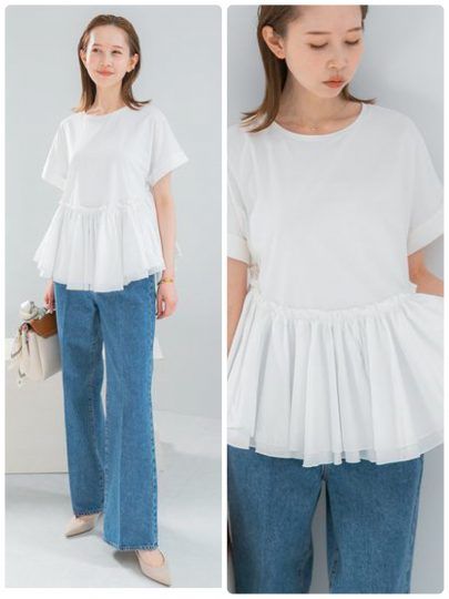 華やかなチュールフリルトップスとイージーな着心地のカットソーをドッキングした、暑い時期にも心地よく楽しめる1枚。顔や肩周りに贅沢に施したチュールや、ペプラムのように広がるエアリーなシルエットが着映えを叶えてくれます。