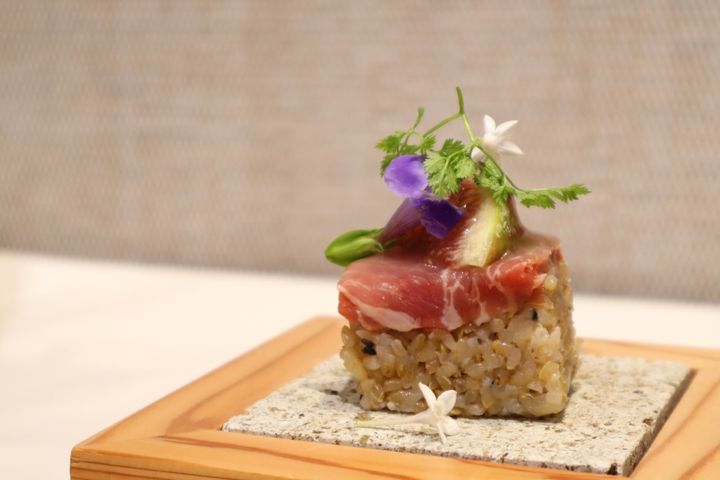 「無花果と生ハムの押し寿司」は玄米専用品種の宮城県産‟金のいぶき”を使用した、和食店ならではの逸品。玄米をお寿司でいただくのは新鮮に感じますが、酢飯にすることで玄米ならではの甘みと酸味がマッチしておいしくなるのだとか。