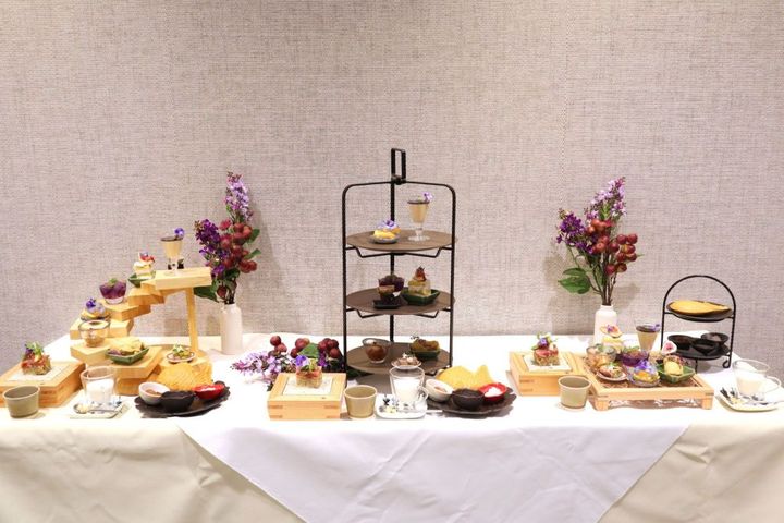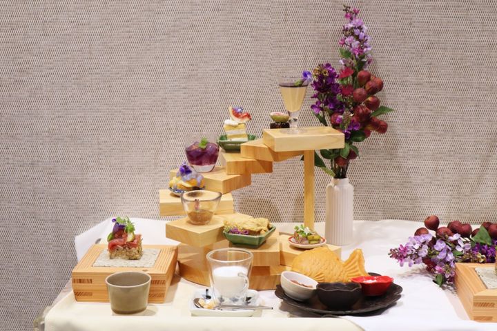 今回のアフタヌーンティーの主役となるのはいちじく。ファンケルならではの和の木組みスタンドには「たたき無花果と葛切り」をはじめ、「紫香る 和のプリン」や「無花果とピスタチオのパテドカンパーニュ」など、いちじくがふんだんにあしらわれた甘味とセイボリーが並んでいます。