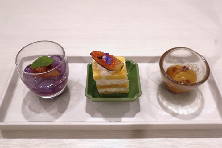 試食会では、スイーツの「たたき無花果と葛切り」「無花果フラワーケーキ」と、一押しのセイボリー「無花果密煮 胡麻酢かけ」をいただきました!