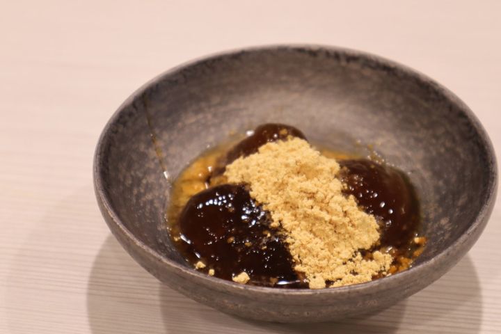 ファンケルならではの美しくも体をいたわったスイーツを堪能していると、何やら大きなワゴンが登場。こちらはお食事中に楽しめるワゴンサービスで、自家製で練り上げたわらび餅を目の前でサーブしていただけるのだとか。