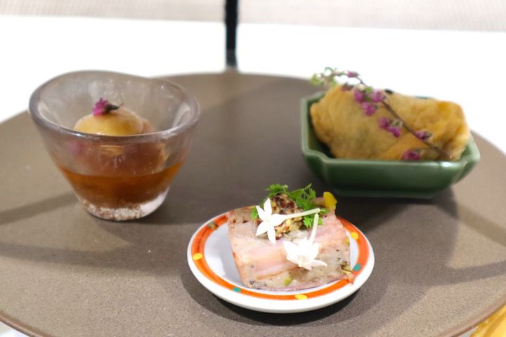 「たたき無花果と葛切り」はライラックカラーの葛切りをたたきいちじくと合わせた一品。つるつるした食感の葛切りとたたきいちじくの異なる食感の組み合わせと、添えられたミントがアクセントとなったさっぱりとした味わいが楽しめます。