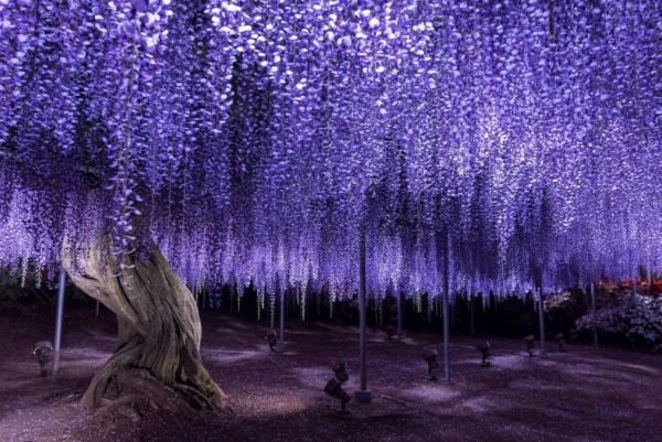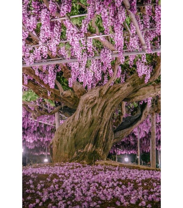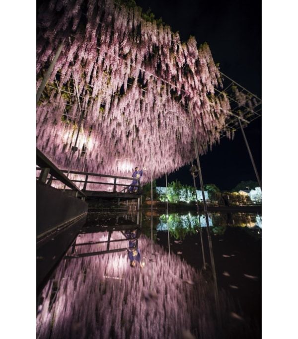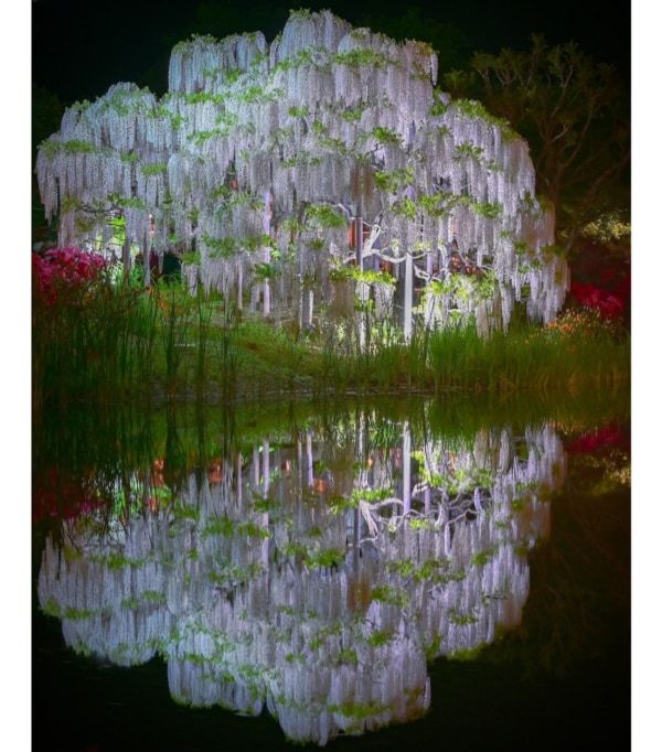 大藤は昨年よりも1週間程度早く開花を迎え、4月8日が開花日となりました。見頃時期に関しても全体的に早まることが予想されるため、幻想的な夜間ライトアップの期間を繰り上げて開催しています。