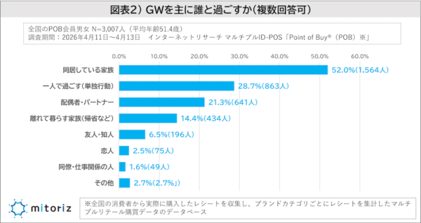 「GWを主に誰と過ごすか」について尋ねたところ、「同居している家族」が52.0%(1,564人)で最も多く、次いで「一人で過ごす(単独行動)」が28.7%(863人)、「配偶者・パートナー」が21.3%(641人)となりました。