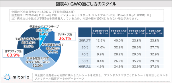 全体として、GWは若年層ほどアクティブに過ごし、年代が上がるほどゆったり過ごす志向が強まっています。