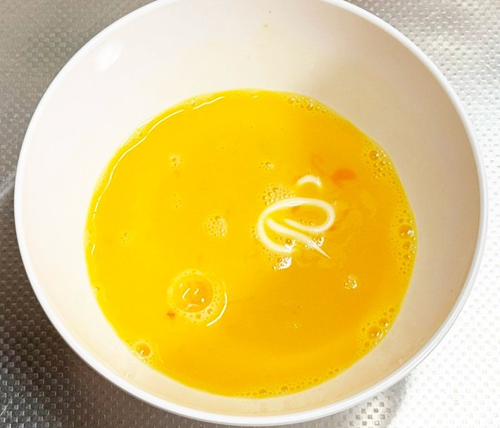まずは、卵を溶いたら白だしや砂糖など、普段と同じ玉子焼きの味つけをします。