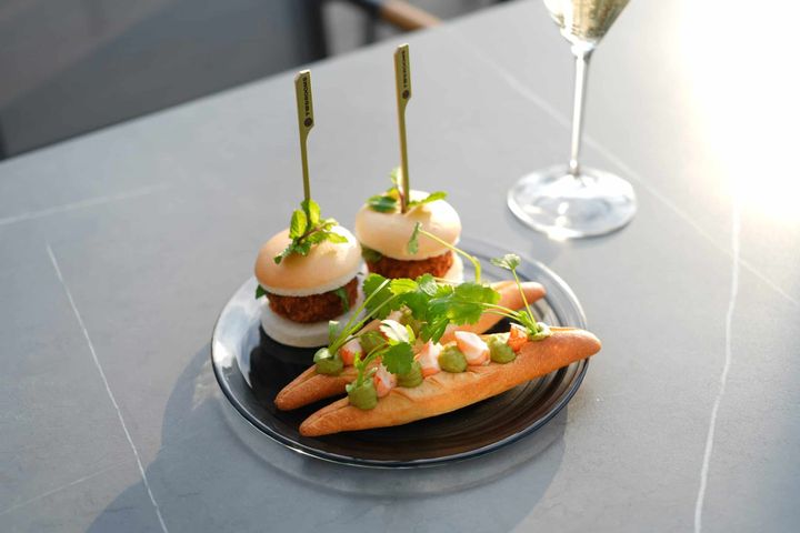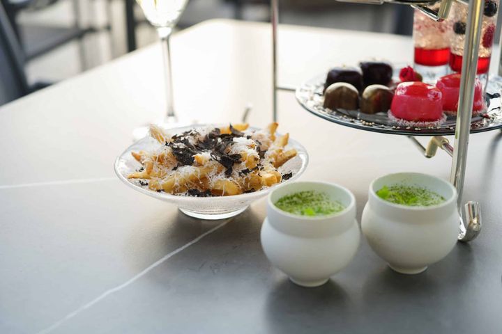 風が心地よくなってきて、テラスで過ごすのにちょうどいい季節が到来。トリュフパルメザンフレンチフライやクラブケーキスライダーなど、食事としての満足度も高いセイボリーと華やかなスイーツが並ぶティースタンドに、目にした瞬間から気持ちまで満たしてくれる。