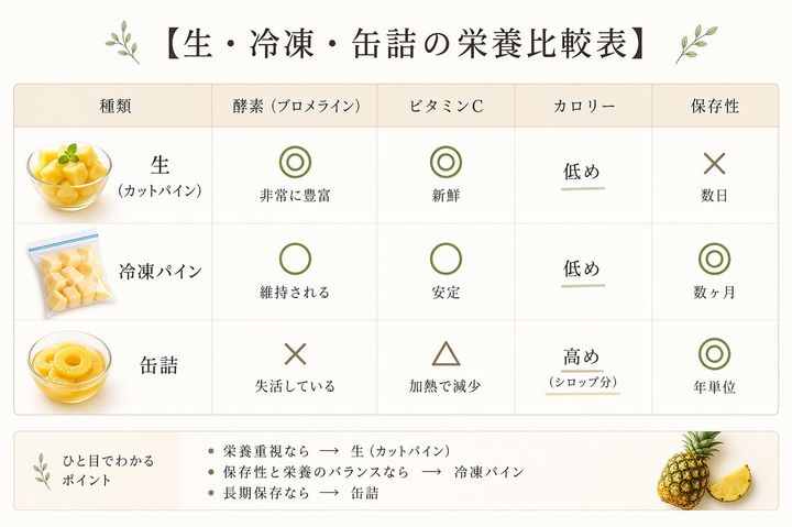 生・冷凍・缶詰で違いはある?パイナップルの種類別・栄養比較と賢い食べ方