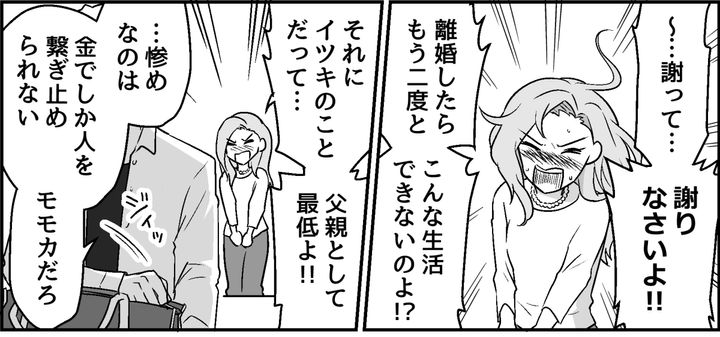 「謝りなさいよ!! 離婚したら、もう二度とこんな生活できないのよ!?」私はそう叫びました。でもトオルの心には届きませんでした。「本当は一緒にイツキも連れて行きたいけれど……。イツキのことは、日を改めてきちんとする」