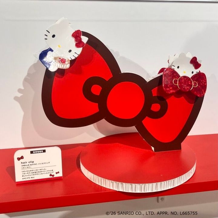 展示会ではハローキティのアイコンでもある赤いリボンの巨大なオブジェにコラボ商品がずらりと並び、ペールブルーとハローキティを象徴する赤のコントラストが印象的な可愛らしい会場でした。