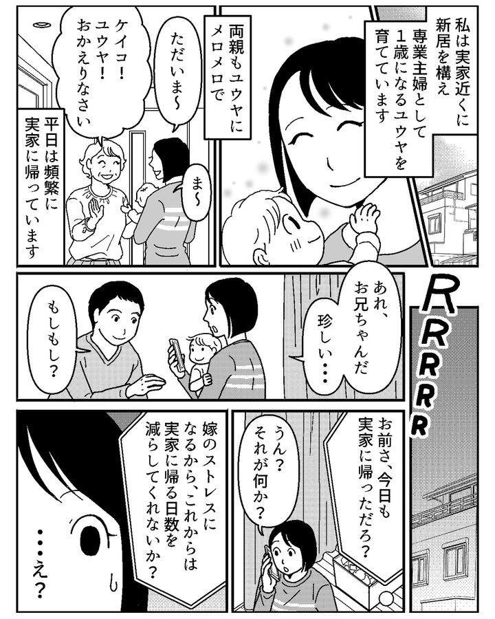 実家近くに新居を構え、専業主婦として1歳になる息子を育てているケイコさん。孫を両親にたくさん会わせてあげたくて、平日は実家に頻繁に帰っていたのだそう。実家は二世帯住宅になっていて、ケイコさんの兄一家が両親と同居しています。