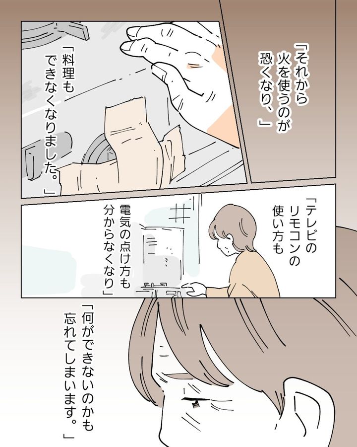 それ以来、義母は火を使うこと自体が怖くなり、好きだった料理もできなくなってしまいました。テレビのリモコンの使い方も、電気のつけ方さえ分からなくなり、やがて自分に何ができないのかさえ、分からなくなっていったのです。