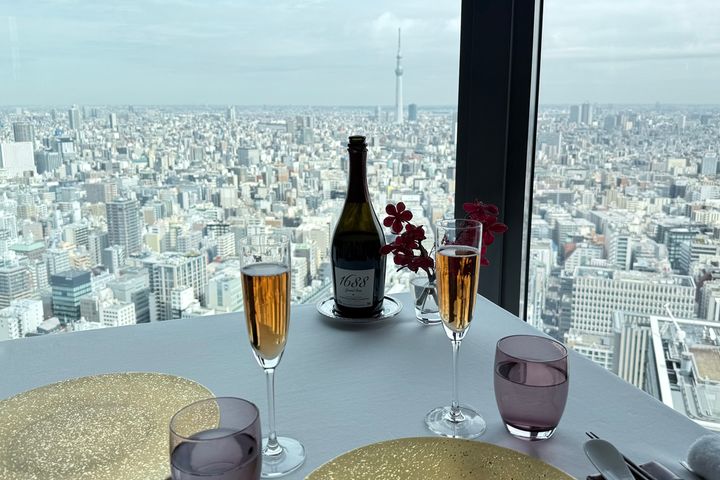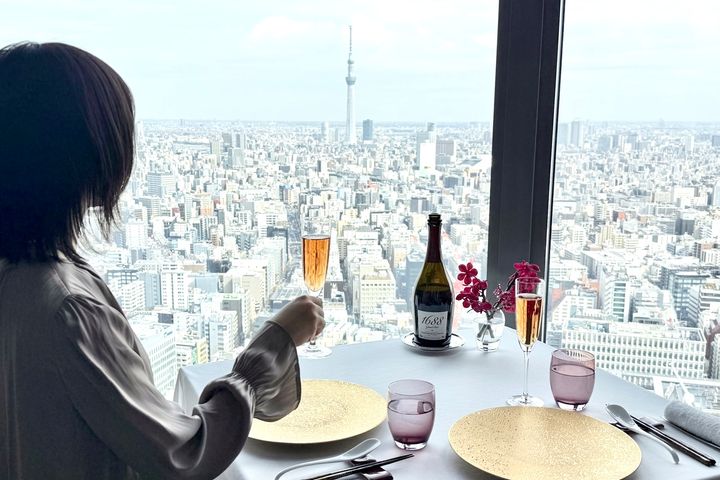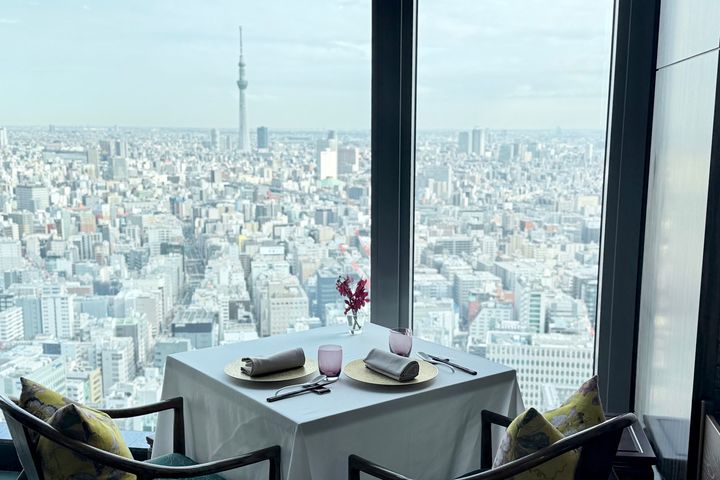 店内に進むと大きな窓が一面に広がり、「東京スカイツリー」をはじめとする街並みを一望できます。周囲に高い建物が少なく視界が開けていて、開放感たっぷり。都会の喧騒を忘れ、優雅なひとときを過ごせそうです。時季によってはディナーを楽しみながら花火を見下ろすこともできるのだそう。