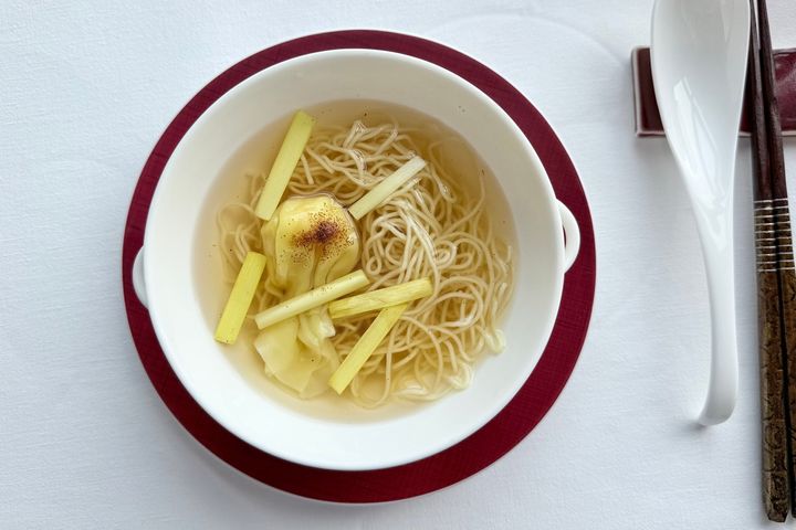 コースの最後の食事は「ずわい蟹と海老の雲呑麺」。澄んだスープがおいしく、サラッとしていてとても飲みやすい! 麺は細麺で、繊細な口当たりながらしっかりとしたコシを楽しめます。