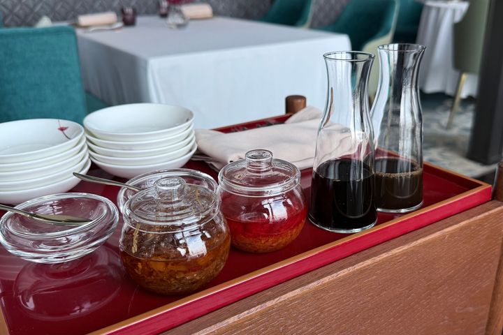 2つ目の料理は広東料理「センス」でも人気の高い点心。いただく前に、コンディメント(調味料)から好みのものを1つ選びます。ラインナップは広東料理「センス」特製のXO醬、豆板醤、しょうゆ、黒酢の4種類。いちばん人気は、干しエビや干し貝柱、金華ハムで仕上げられた自家製のXO醬です。