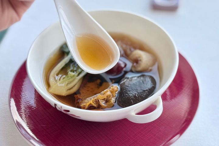 まずはアミューズ として、ひと口分のスープ「SENSEの上湯(シャンタン)」をいただきます。金華ハムと鶏肉、豚肉などを煮込んで作られた極上のスープは、調味料を何も加えず上品で澄んだ味わいが印象的。このスープはさまざまな料理で使われているのだそう。