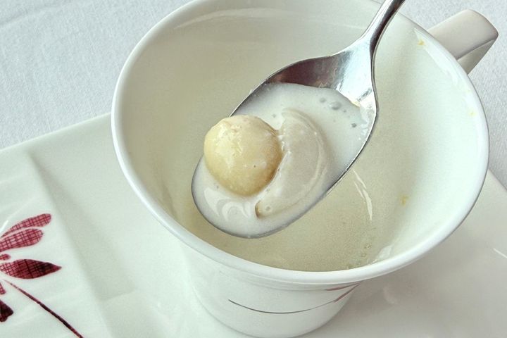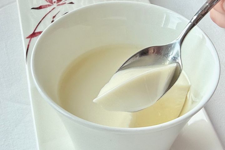 こちらが「昔の杏仁豆腐」。杏仁には肺や腸をうるおす効果があると言われていることから、中国では古くから薬膳として飲まれていました。スープのようになっていて、同じく薬膳の効能がある百合根や蓮の実が一緒に煮込まれています。