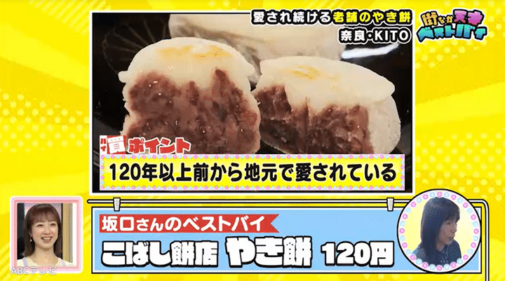 WOOD FIRE DININGで元同僚たちと食事をしていたマダムは、創業120年以上を誇るこばし餅店のやき餅がベストバイ。このやき餅の主な原材料は、小豆と餅米と砂糖。素朴な味わいで、吉野では知らない人はおそらくいない銘菓です。人気すぎるため、「土日なんかは予約しないと買えない」そうで、元同僚の1人は「5年ぐらい食べられてない!」とのことでした。