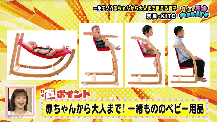 スクロールチェアは、すぐ使えなくなる育児用品の課題を解消した画期的アイテム。「ゆりかごにもなるし、成長したら子ども用の椅子にもなるし、そのまま大人まで座れる」とのこと。ますみは、「結婚する予定まだないんですけど先買います!」とスクロールチェアに興味津々でした。
