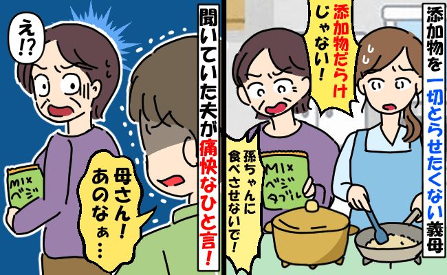 ある日、義母がお出かけのついでにとわが家へ遊びに来ました。ちょうどお昼前だったので2歳の息子にお昼ごはんを用意していると、義母がキッチンにやってきて……。冷凍のミックス野菜を使いチャーハンを作っている私に「こんな体に悪影響な物を使っているの? ちゃんと無農薬の野菜を使わないと!」とひと言。さらに「健康に気をつけているかずっと気になっていたのよね」と言い、そこから義母の添加物探しが始まりました。