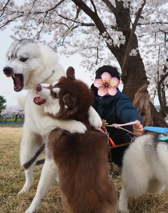 満開の桜の下で思いがけず繰り広げられた、犬たちの元気いっぱいな大乱闘。
