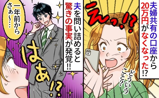 ある日のこと。そういえば口座にいくらあるのかなと気になり、夫に聞くとのらりくらりと言い訳をして見せてくれません。怪しく思って寝ている間にログインすると、20万円の引き落としがありました。