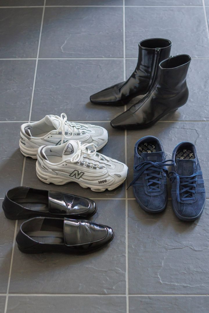 愛用するフラットシューズたち。上からTOTEME(トーテム)のショートブーツ、アディダス、ニューバランスのスニーカー、HIDEYA HOUSE (ヒデヤハウス)のローファー。 YOSHINORI.KUBO