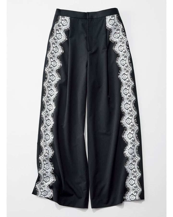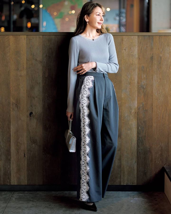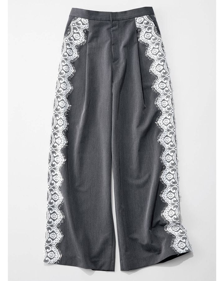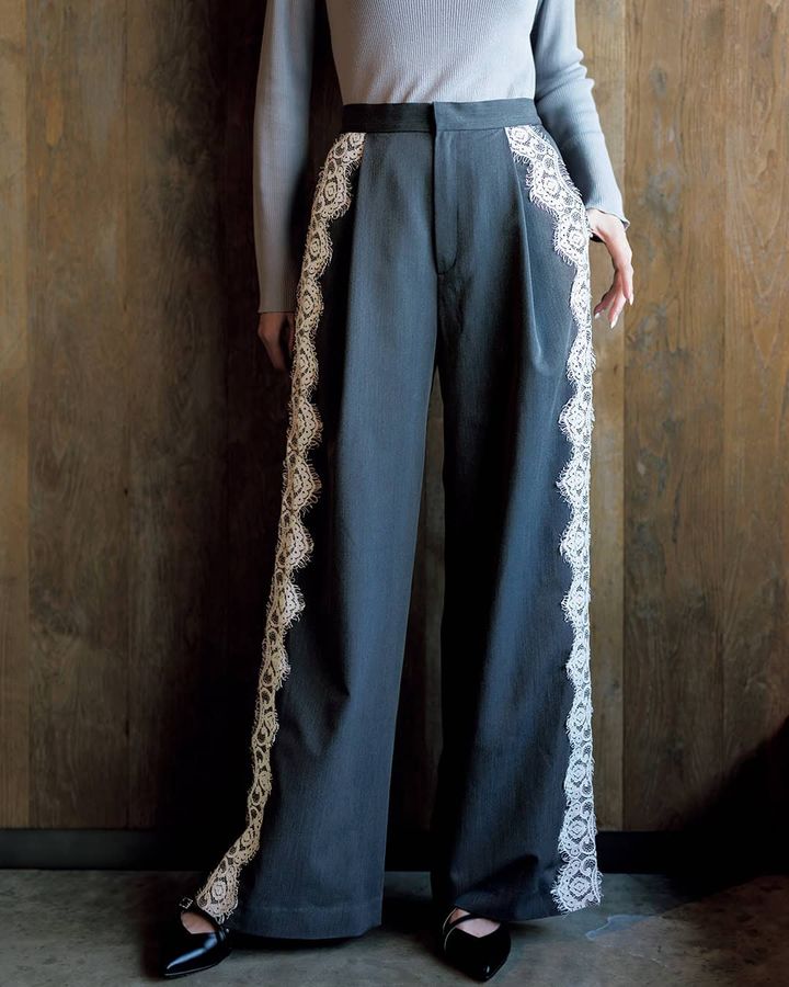 多スクな40代にピッタリなスタイルもよく見える名品パンツ。サイドラインをレースで表現することで大人に必要な〝品〟を確保できます。レースが視線を縦に誘導し強調されるので脚長効果も期待できます。華やぎと上品なカジュアルさが網羅できて一挙両得。ウエストはバックゴム仕様だからリラックスできます。自宅でのお手入れができます。