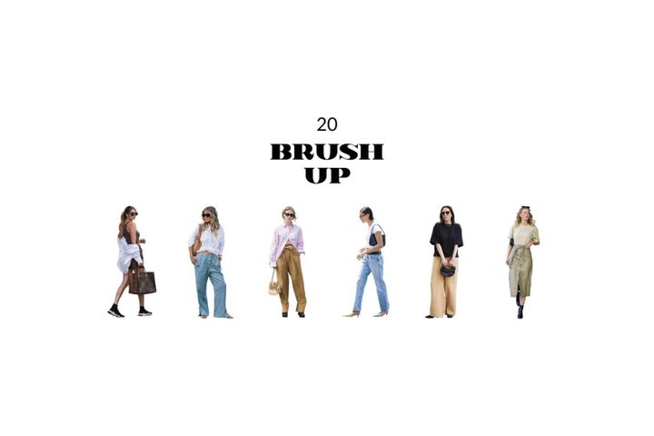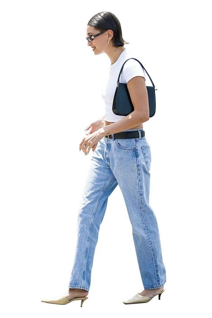 白T+ブルーデニムの、王道カジュアルを、クラシカルな小物づかいでLADYに引き上げ。ワンショルバッグや先細パンプスなど、コンパクトな形なら、スマートな印象も得られる。