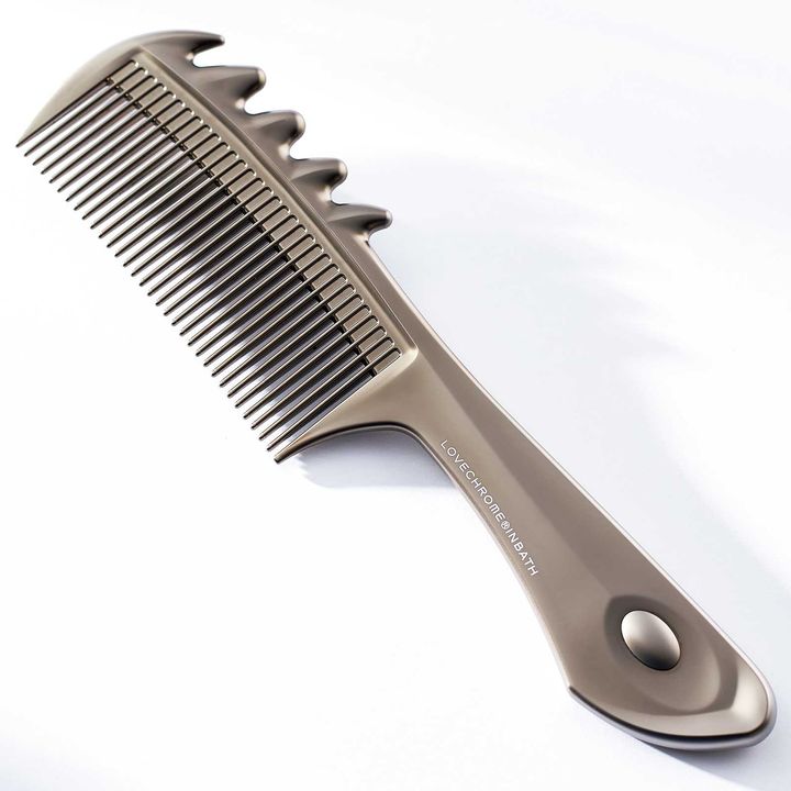 「トリートメントを開発する際の検証では、塗布後に適切な間隔のコームを通しまんべんなく纏わせた後に5分ほど髪に馴染ませると、浸透効果が格段にアップしました。コームを寝かせて使うとトリートメントを削ぎ取ってしまうので頭皮に対して垂直に、1ブロック1回ずつ通すだけでも違いは歴然です」摩擦を抑え、髪ダメージを軽減する表面加工。ラブクロムⓇINBATHスカルプカッサ プレミアムブラック ¥6,490()