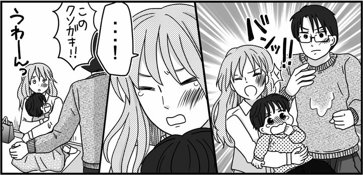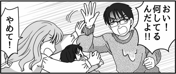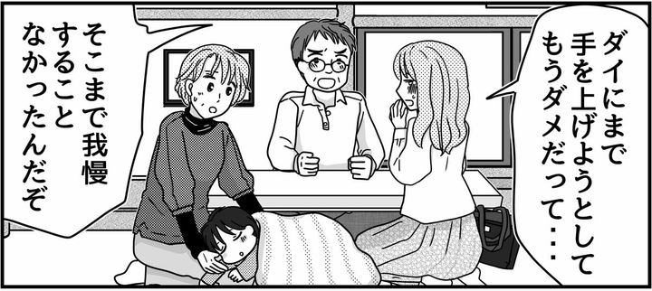 ある日のこと、私たち3人は家族で食事をしていました。そんなときに息子のダイが手に持った牛乳パックを傾けてしまい、ノボルさんのほうにこぼれてしまったのです。ノボルさんはガタンと立ち上がり、ダイに手を振り上げました。私は咄嗟にダイの前に飛び出しました。ノボルさんの手が私の頬を激しく叩きました。