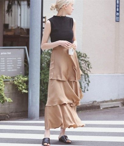 甘めな装飾スカートは、ごくシンプルに自作のワンピース感覚でコーディネート。すっきり腕を出したコンパクトなトップスをタックインすれば、スカートの構築的なデザインも引き立ち、さらなるスタイルアップ効果も実感できる。