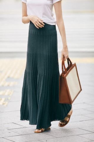 せっかくなら脚も長く見せられる、地面スレスレの丈を。ウエストがゴムで身長に合わせて調整できる、誰でも理想の丈に調整できるものがベスト。夏にあえてのニットという重みが、シンプルな白Tの飾りにも。