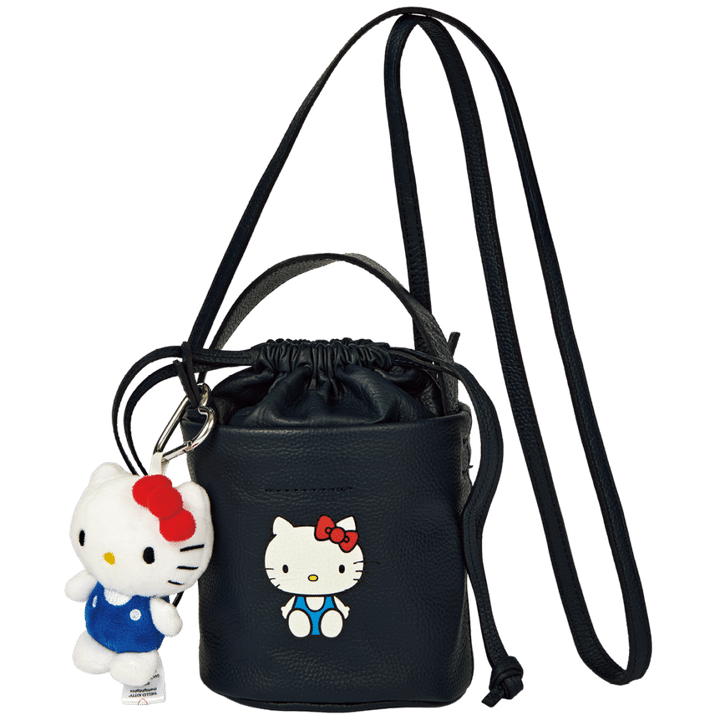 ネイビーハローキティバッグ[H13×∅13㎝]¥55,000、バッグに付けたハローキティチャーム¥4,400(共にザハイライツ)