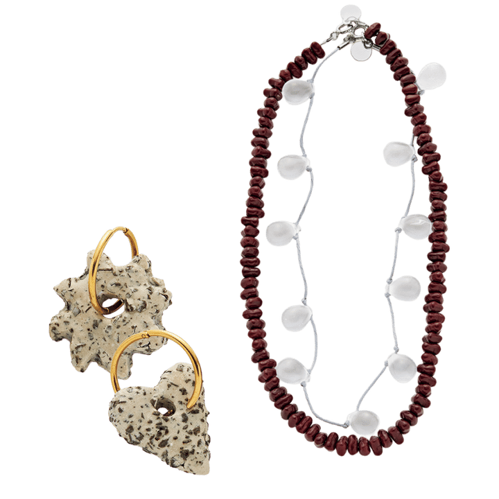 右:外側からブラウンガラスネックレス¥17,600、クリアガラスネックレス¥16,500(共にシシジョイア)、左:イヤリング¥24,200(レヴェンス ジュエルズ/全てギャルリー・ヴィー 丸の内店)