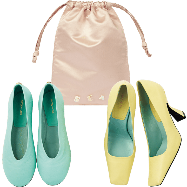 ピンクサテン巾着[H27×W21㎝]¥13,200(シー/エスストア)、イエローパンプス[ヒール6㎝]¥135,300、ライトブルーバレエシューズ[ヒール0.5㎝]¥115,500(共にセルジオ ロッシ/セルジオ ロッシ ジャパン カスタマーサービス)