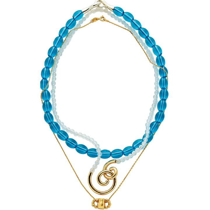 外側からブルーネックレス¥35,200、ホワイトネックレス¥49,500、ゴールドネックレス¥22,000(全てラ・ムーン/トートロジー)