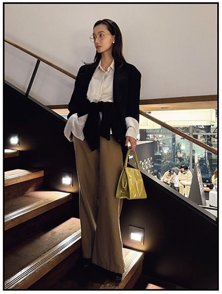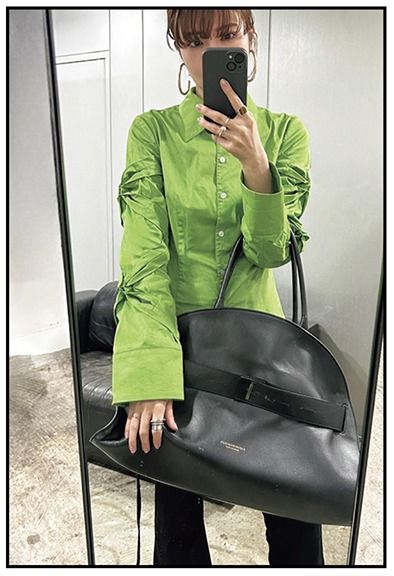 「スタイリングのアクセントをバッグに託すことが多いので、さし色になりそうなものに日々アンテナを張っています。ふらっと立ち寄ったヴィンテージショップで見つけた、プラダのハンドバッグはエナメル加工されたイエローのレトロ感が刺さり、即購入。がま口タイプで使い勝手もよく早くもスタメンに追加」(梅本さん)