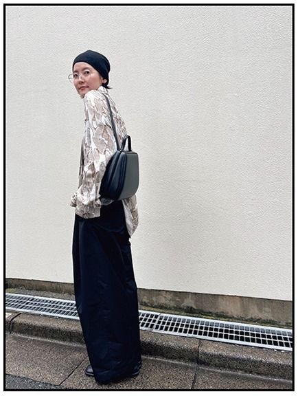 「コロンとした形が可愛いArchivepkeのレザーリュックは、背負うほかに肩がけやハンドル持ちなど、さまざまなバリエーションで楽しめます。ミニマムなルックスで、リュックとして持ったときに幼くならないところもお気に入り。モノトーンのミニが私的定番なので、こんなバッグは何個あっても困りません」(上枝さん)
