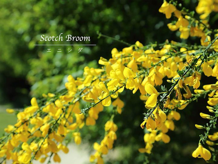 エニシダという名前はラテン語の「genista(ゲニスタ)」に由来し、それが日本に伝わった際に訛ってエニシダになったとされています。漢字では金雀枝と書き、小さな黄色い花が群れ咲く様子を、金の雀にたとえたもの。エニシダの英名はScotch broomやthe common broomで、broomは「ほうき」という意味です。ヨーロッパでは、昔はエニシダの枝を使ってほうきを作っていたとされ、魔女がまたがって飛ぶほうきもエニシダで作られているという伝承があります。