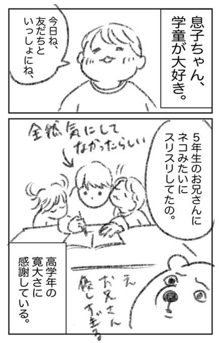 元ヒグママさんの息子さんは、学童が大好き。5年生のお兄さんにネコのようにスリスリしていたとのこと。微笑ましい様子が目に浮かびますよね。年上のお兄さんが優しく受け入れてくれているからこそ、こんなふうに安心して甘えられるのかもしれません。さすが、高学年のお兄さんは寛大ですね。まさしく、菓子折りを持ってお礼に伺いたくなる勢いです。