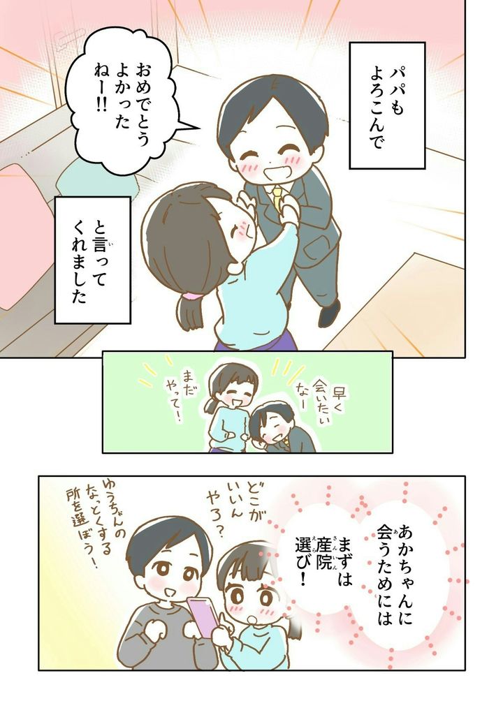 夫婦で妊娠を喜びあえるのは素敵ですね。一緒に産院を探し、一緒に出産を準備をする姿がほほえましいですね。