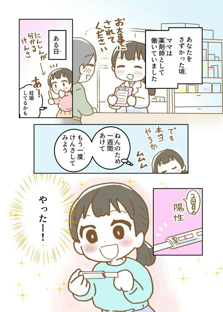 主人公は、薬剤師として働く女性。初めての妊娠が発覚し、パパと一緒によろこびを分かち合います。赤ちゃんをお迎えする準備や産院選び、そして仕事と妊娠の両立など、妊娠生活で気になることが描かれています。※この作品は、ママリユーザーさんの出産体験をインタビューし、漫画化したものです